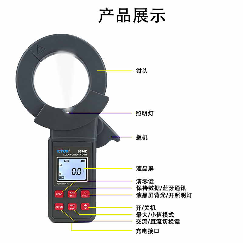 ETCR6670D大口徑直流/交流鉗形電流表鉗表具有直流/交流真有效值測量、最大值/最小值/平均值測量等功能。鉗表具有數(shù)據(jù)保持、藍(lán)牙通訊功能,使用大容量鋰電池type-c充電口,是一款新型的電工安全檢測必備工具。