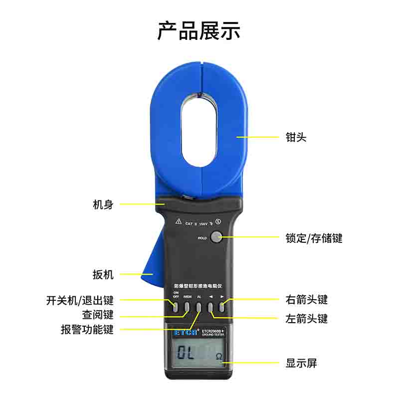 ETCR2000B+防爆型鉗形接地電阻儀能測量出用傳統方法無法測量的接地故障,能應用于傳統方法無法測量的場合,因為鉗形接地電阻儀測量的是接地體電阻和接地引線電阻的綜合值。