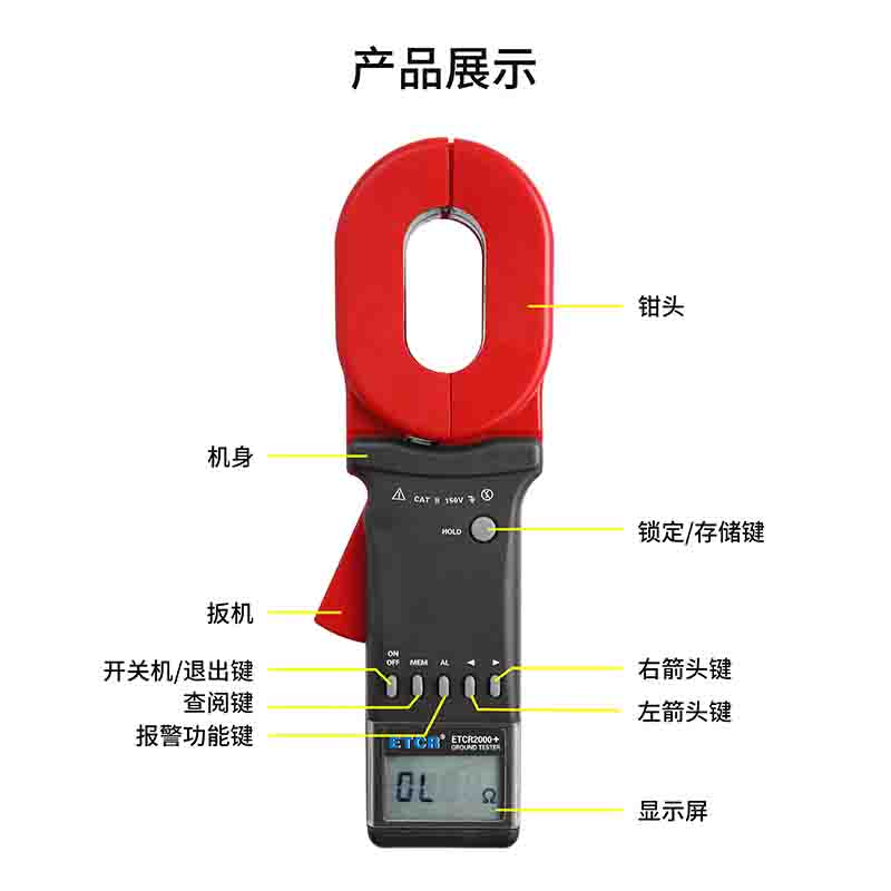 ETCR2000+鉗形接地電阻儀能測量出用傳統(tǒng)方法無法測量的接地故障,能應(yīng)用于傳統(tǒng)方法無法測量的場合,因?yàn)殂Q形接地電阻儀測量的是接地體電阻和接地引線電阻的綜合值。