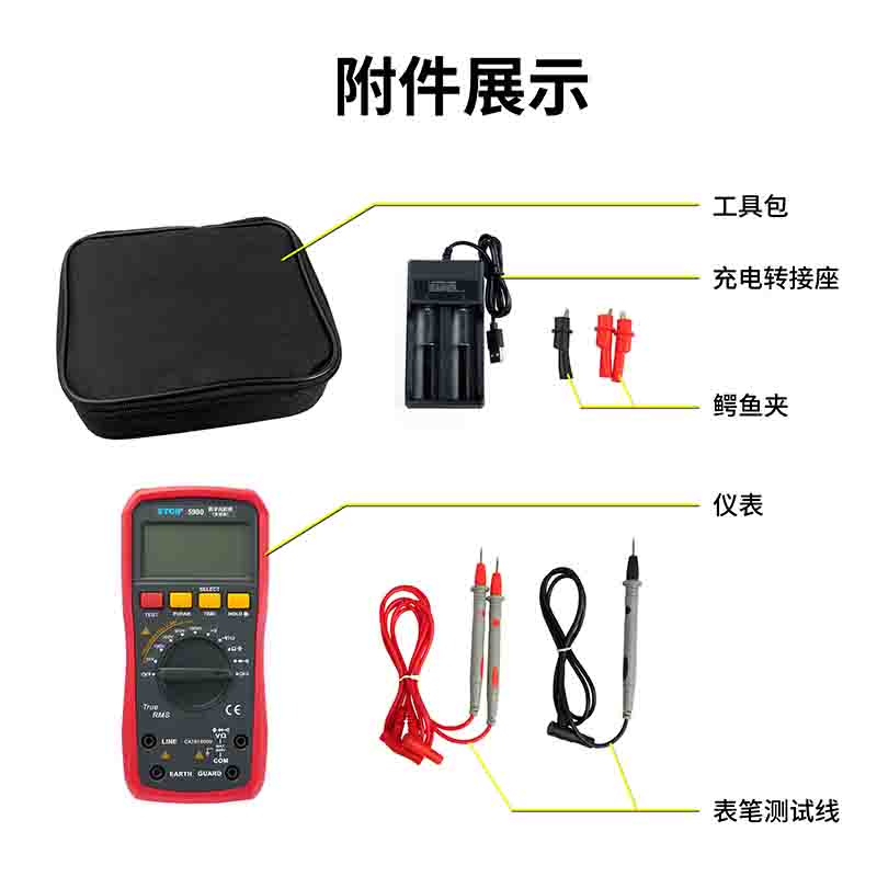 | ETCR5930數字萬用表 | DC 0.0mV~600V AC 0mV~600V | DC 0.0uA~10A AC 0.0uA~200mA | 0.0Ω~20MΩ | 0.0nF~2mF | 0.0Hz~20MHz | 0℃~1000℃ |