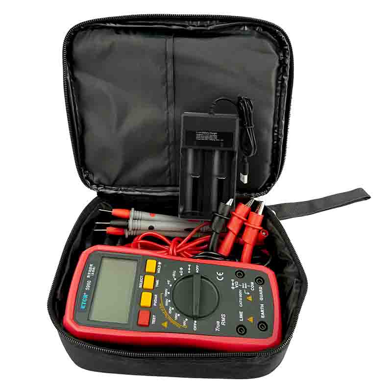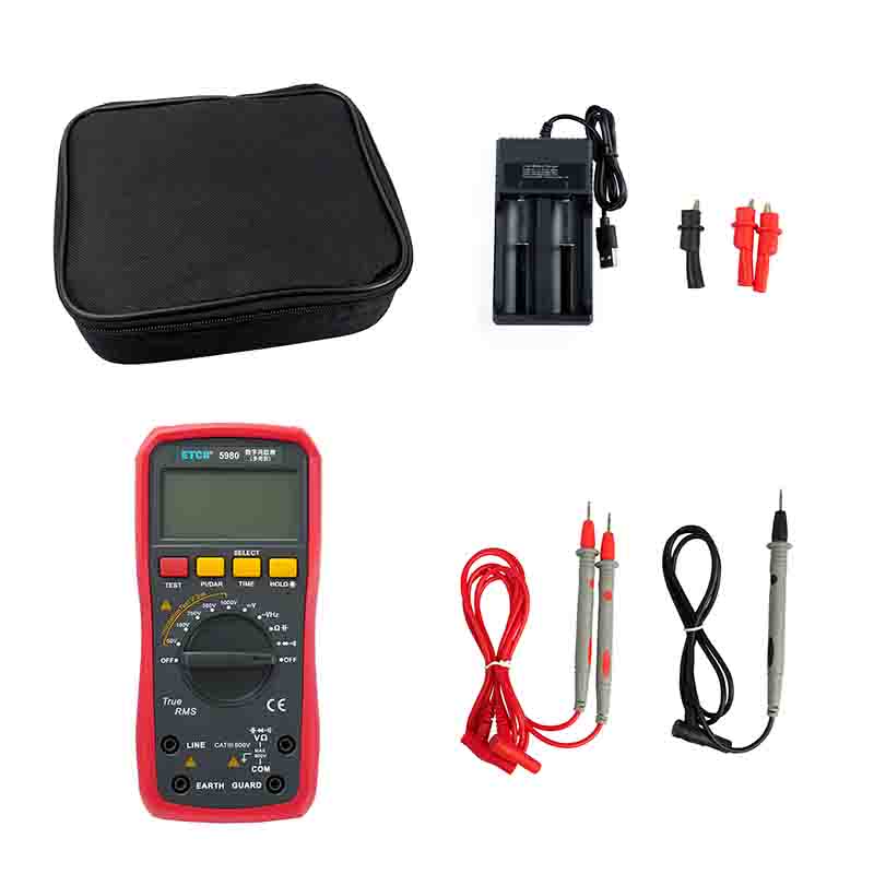 ETCR5980數字兆歐表(多用表)是一款數字式兆歐表+數字萬用表。絕緣電阻測試電壓可選50V/100V/250V/500V/1000V。它可適時監測絕緣電阻測試電壓,有效避免因輸出電壓不符合額定值要求而造成的誤判。儀表絕緣電阻測量最高可達到20GΩ,可根據需要設置測量時間,測量完畢后自動保持測量結果。數字多用表功能有交直流電壓、電阻、電容、頻率、二極管及通斷測量等。本產品適用于測量變壓器、電機、電纜、開關、電器等各種電氣設備及絕緣材料的絕緣電阻,對各種電氣設備進行保養維修、試驗及檢定。它結構精巧,攜帶方便,是您理想的電工、電子測試儀表。