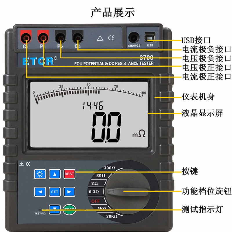 | ETCR3700A便攜式等電位聯(lián)結(jié)電阻測(cè)試儀 | 0.001mΩ~40.0kΩ | 4mΩ、40mΩ、400mΩ、4Ω、40Ω、400Ω、4kΩ、400kΩ | 1.2A MAX | —— | 9999組 | 藍(lán)牙、USB |