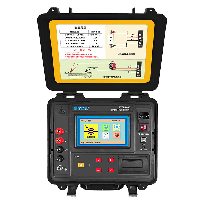 ETCR3650接地引下線導通測試儀專門用于接地裝置的電氣完整性測試,其各項技術指標均達到或優(yōu)于相關標準要求。儀器由主機、測試線等組成,儀表采用微處理機技術,精密四線法測試,準確可靠。儀表有AC220V及大容量鋰電池兩種供電模式,自動測量及手動測量兩種測量模式,儀表采用5寸全彩高清觸摸屏,帶背光調節(jié)功能,強光下清晰可見。儀表外殼采用防水保護箱,防撞、防摔、防水堅固安全耐用,儀表帶有內置打印機、藍牙通訊,USB接口。儀器操作簡單方便、精度高、測試速度快,復測性好、讀數直觀,是符合規(guī)程要求的理想的專用儀器,大大方便了試驗項目的開展,提高了工作效率。