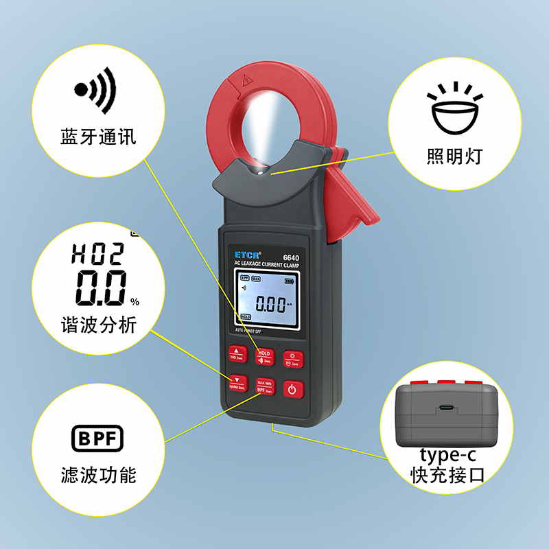 ETCR6640鉗形漏電流表可測試40Hz~1kHz頻率范圍的電流。鉗表還具有背光、手電筒、數(shù)據(jù)存儲、藍牙通訊等功能。鉗表使用大容量鋰電池type-c充電口,是一款新型的電工安全檢測必備工具。