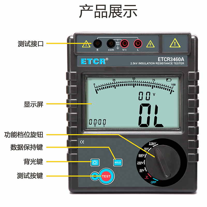 | ETCR3460B絕緣電阻表 | 50V、250V、500V、1000V、2500V、5000V | 0.1MΩ~1000GΩ | 2mA MAX | AC/DC:0V~750V |