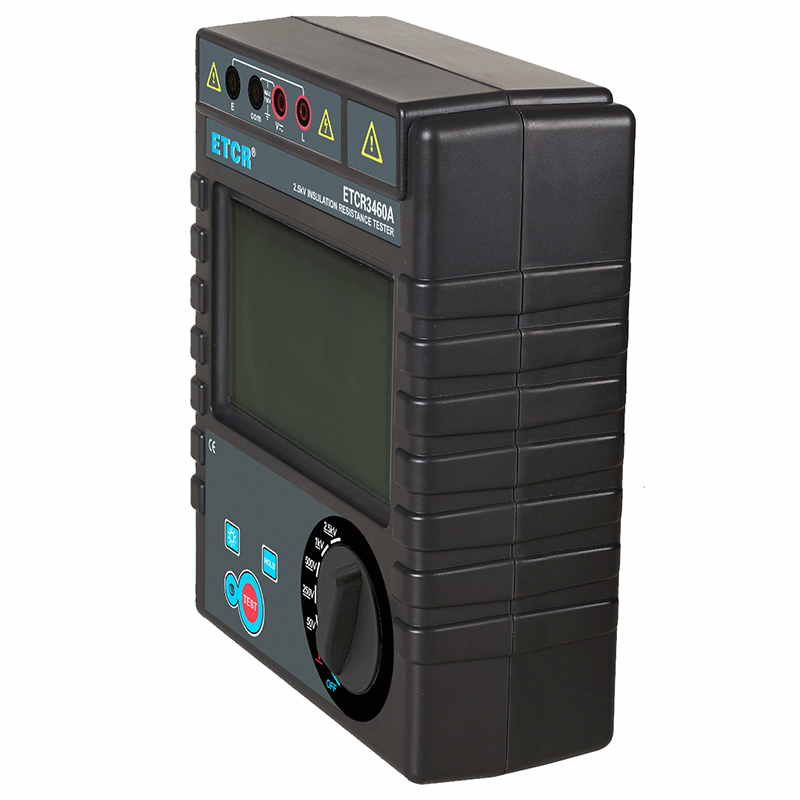 ETCR3460A絕緣電阻表又名兆歐表、絕緣電阻測試儀,用于絕緣電阻測試。儀表具有LCD大屏幕帶背光顯示、數據保持、自動放電、自動關機等功能。儀表具有測試計時,電壓監測功能,回路電壓大于36V時,儀表將禁止測試以保護被測物及人員安全。儀表功能操作簡易,絕緣電阻值,測試時間,輸出電壓同屏顯示,具備交流電壓、直流電壓測試功能。
