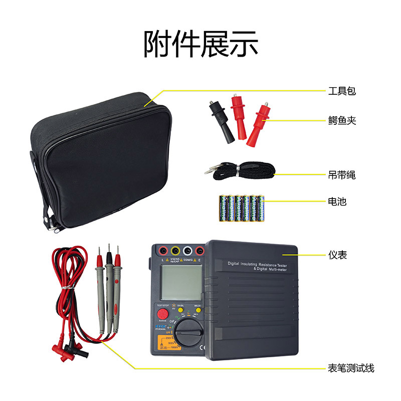 本產品是一款絕緣電阻萬用表。其功能齊全,準確度高、操作可靠、使用方便。絕緣測試電壓可切換。普通絕緣電阻表不能測量自身輸出的高壓,在絕緣電阻表輸出高壓不符合額定值時,用戶不容易發現,以至有時測量結果偏差過大,造成安全隱患,可適時監測輸出高壓,用戶在任何時候都能觀察到儀表實際輸出的測量電壓,有效避免因輸出電壓不符合額定值要求而造成的誤判。儀表測量范圍最高可達到40GΩ,可根據需要設置測量時間,測量完畢后自動保持測量結果。數字多用表功能有交直流電壓、電流、電阻、電容、頻率、二極管及通斷測量等,數字萬用表功能和絕緣電阻表功能是完全分開的,在使用萬用表功能時,不必擔心會被絕緣電阻表產生的高壓電擊。本產品適用于測量變壓器、電機、電纜、開關、電器等各種電氣設備及絕緣材料的絕緣電阻,對各種電氣設備進行保養維修、試驗及檢定。它結構精巧,攜帶方便,是您理想的電工、電子測試儀表。