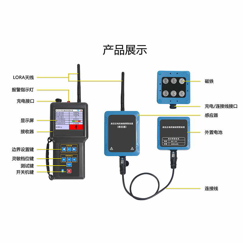 5、聲光報(bào)警功能:觸發(fā)報(bào)警功能時(shí),接收器報(bào)警指示燈連續(xù)閃爍,蜂鳴器發(fā)出“嗶-嗶-嗶”,揚(yáng)聲器播報(bào)語(yǔ)音提示”有電危險(xiǎn),請(qǐng)勿靠近”。