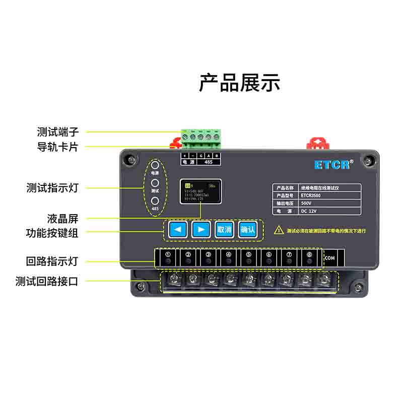 ETCR3580絕緣電阻在線監測儀又稱絕緣電阻在線測試儀,用于在線監測電纜、電機、開關、電器等各種電器設備及絕緣材料的絕緣電阻值。監測儀采用高清晰OLED液晶屏,測試參數可在儀器按鍵或后臺設置,安裝方便,測試可靠。監測儀可監測1~8個回路的絕緣電阻值,測試必須在被測回路不帶電的情況下進行。