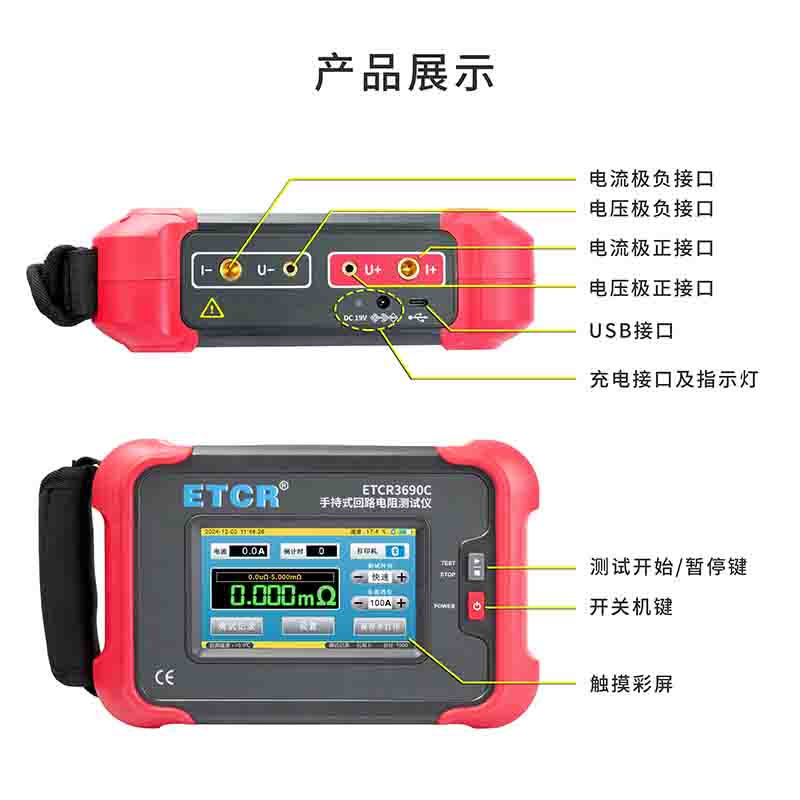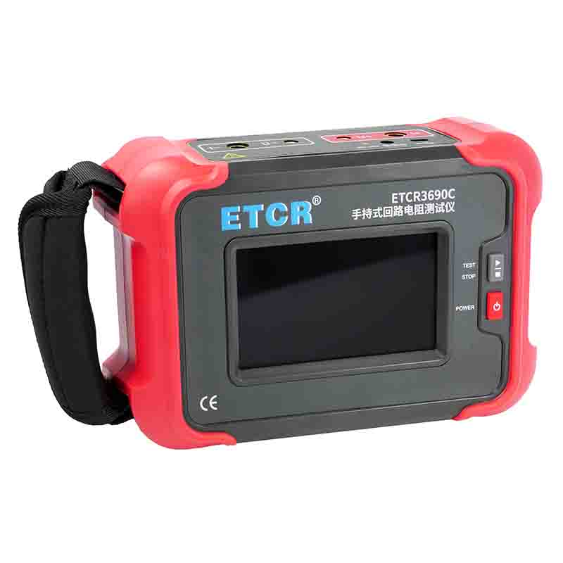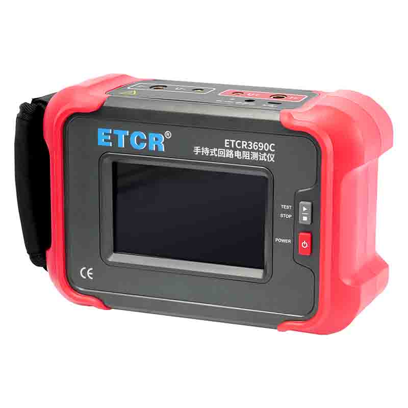 ETCR3690C手持式回路電阻測試儀根據(jù)人體工程學(xué)原理設(shè)計,手感舒適,特殊設(shè)計的機(jī)體結(jié)構(gòu)具有絕緣、封閉,防漏電、防風(fēng)沙,減震防護(hù)等功能。儀表采用高亮度5寸觸摸彩屏,操作簡易快速功能直達(dá),字符清晰明亮,中英文顯示界面。儀表有多檔測試電流可選,儀表顯示當(dāng)前檔位的測試范圍,用戶可自行選擇電流檔位及測試時間,滿足用戶不同場合的要求。
