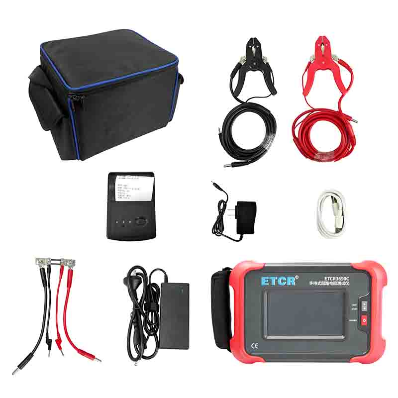 ETCR3690C手持式回路電阻測試儀由主機(jī)、監(jiān)控軟件、測試線、電源適配器、USB通訊線等組成。儀表可存儲測試1000組數(shù)據(jù),用戶可通過藍(lán)牙通訊讀取數(shù)據(jù)記錄,也可通過USB接口及上位機(jī)軟件將數(shù)據(jù)記錄上傳電腦,進(jìn)行歷史數(shù)據(jù)讀取、查閱、保存等功能。儀表配置熱敏式打印機(jī),可在現(xiàn)場打印測試結(jié)果。