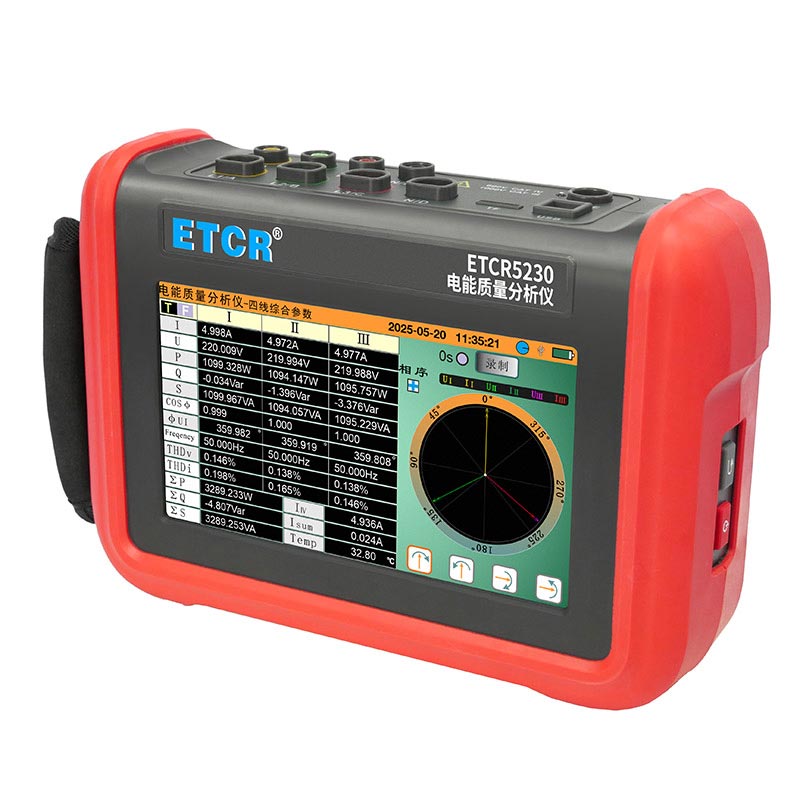 ETCR5230電能質量分析儀是我公司精心研制的一款專為現場測試三相電能質量的高精度綜合型測試儀器。儀表具有智能化、功能完善、人機操作簡潔、中英文雙語操作界面等特點。儀表采用7寸觸摸彩屏、體積小重量輕、攜帶方便,可選配多款電流鉗。儀表可同時測量4路電流(ABC三相及中性線電流),3路電壓、三相不平衡度、有功功率、無功功率、視在功率、諧波比、總諧波失真度等;顯示電流電壓的實時波形、相量圖;動態捕捉電壓電流瞬時變化,監測啟動電流,監測各電力參數并生成告警列表,長時間記錄測試數據并生成趨勢曲線圖等功能。