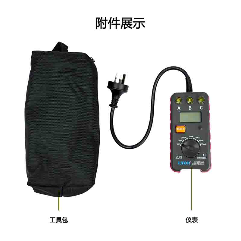 ETCR8610插座式漏電保護(hù)器測(cè)試儀專為現(xiàn)場(chǎng)檢查三極插座工作狀態(tài)同時(shí)測(cè)試漏電保護(hù)器的漏電動(dòng)作時(shí)間,測(cè)試電流從10~35mA分6檔(10mA、15mA、20mA、25mA、30mA、35mA),測(cè)試漏電流動(dòng)作時(shí)間量程為0.001s~1.000s。測(cè)試時(shí),將儀表的三極插頭插入三極插座。儀表的指示燈A、B、C顯示插座工作狀態(tài)及接線是否正確,測(cè)試漏電流動(dòng)作時(shí)間。儀表便攜式設(shè)計(jì),體積小、重量輕、外觀精致,便于攜帶,是各種漏電保護(hù)器現(xiàn)場(chǎng)或室內(nèi)檢測(cè)的理想工具。