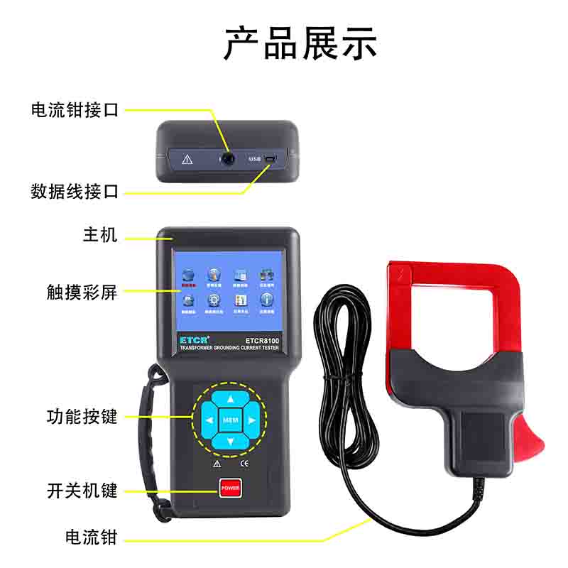 | ETCR8100變壓器鐵芯接地電流測試儀 | AC 0.00mA~1000A | 0Hz~1000Hz | 80mm×80mm | 可設置報警閾值 | 100組 |