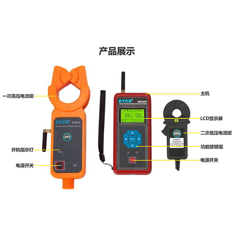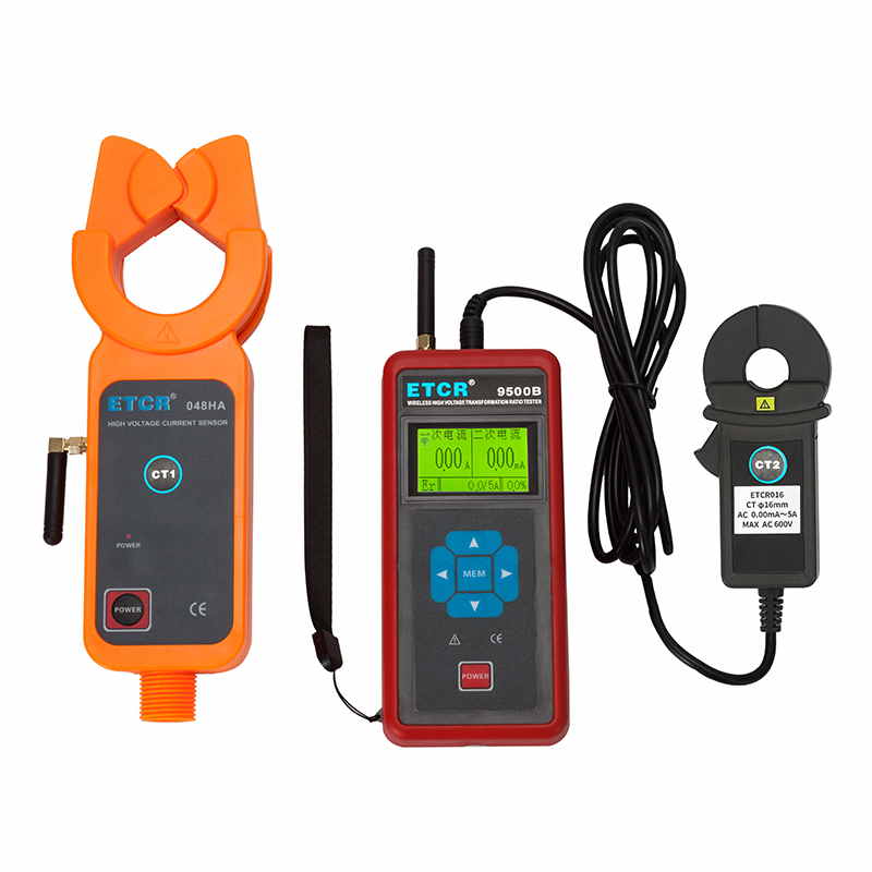 ETCR9500B無線高壓CT變比測試儀又稱互感器電流變比測試儀、互感器比差測試儀、電流互感器變比測試儀,用于35kV以下電流互感器的一次電流、二次電流大小、變比,相別、極性判斷。廣泛應用于變電站﹑發電廠﹑電力稽查部門、工礦企業以及檢測站﹑電工維修部門進行電流檢測、反竊電及野外電工作業等。